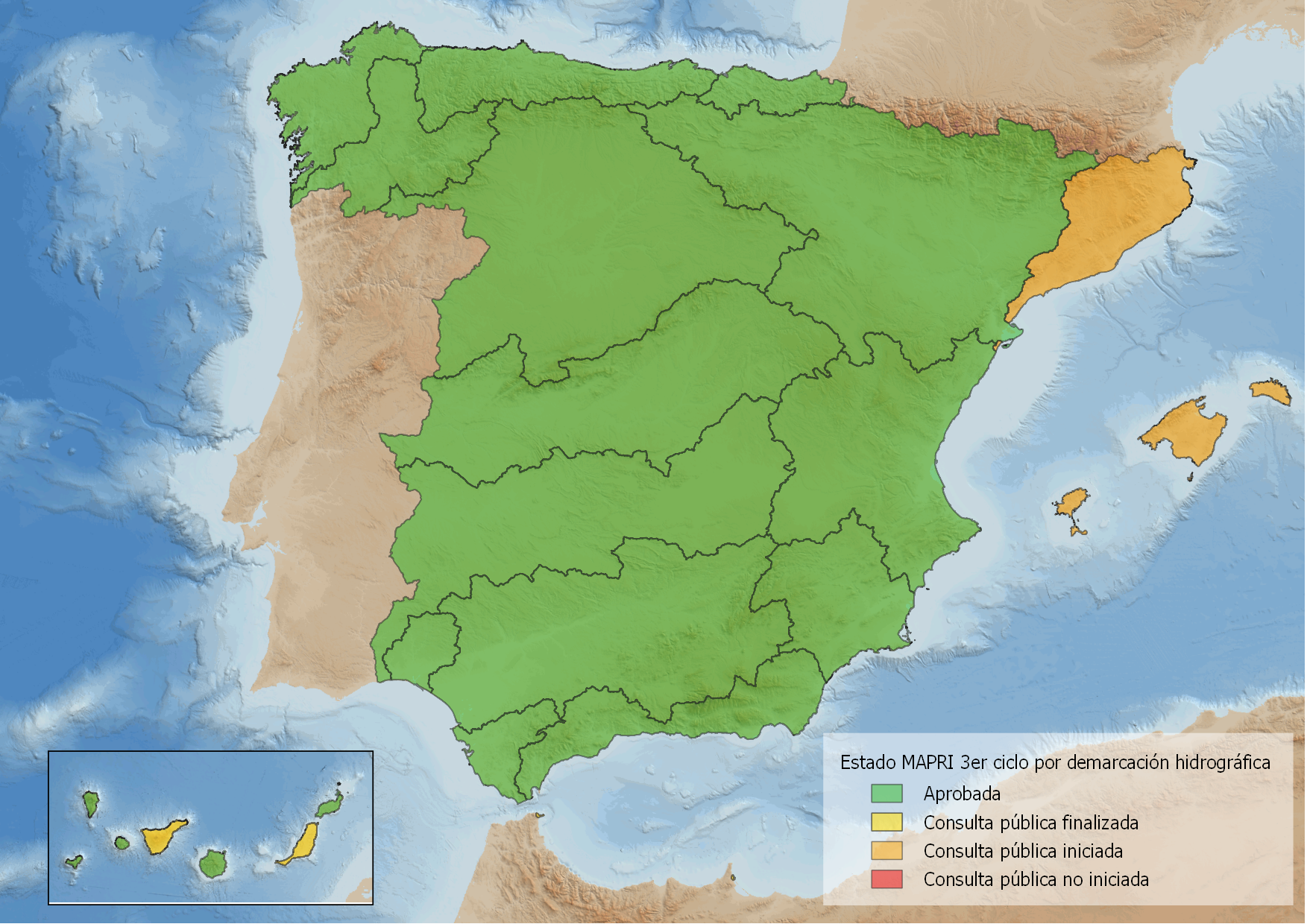 Actualmente se ha aprobado la EPRI del tercer ciclo para las demarcaciones hidrográficas intercomunitarias, así como para algunas intracomunitarias, tal como se muestra en el mapa. Puedes acceder a información detallada sobre las EPRI ya aprobadas y los procesos de consulta pública a través de los siguientes enlaces.