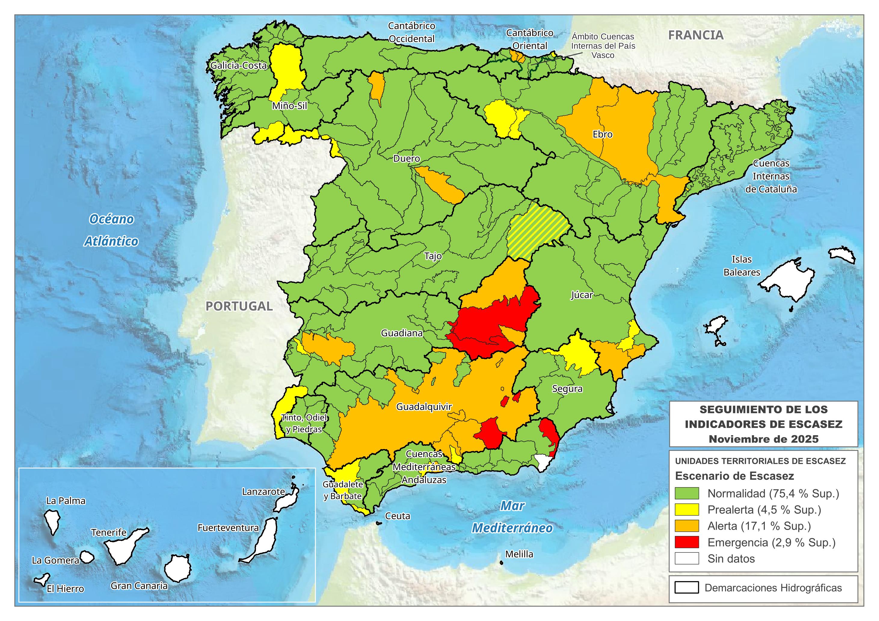 A través de los enlaces de la siguiente Tabla se pueden descargar los informes y mapas mensuales de sequía y escasez del año 2025. Para cada mes, los mapas corresponden al último día del mes anterior, elaborándose los informes a partir de dichos datos.