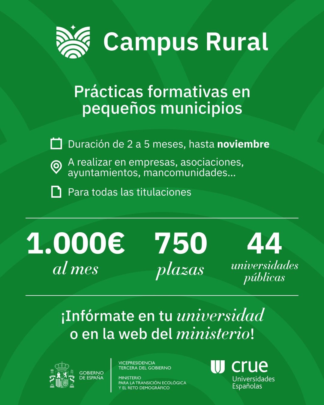 Es un programa del Ministerio para la Transición Ecológica y el Reto Demográfico (MITECO), en colaboración con el Ministerio de Ciencia, Innovación y Universidades, la Conferencia de Rectores de Universidades Españolas (CRUE) y la mayoría de Universidades públicas españolas que ofrece a estudiantes universitarios la oportunidad de realizar prácticas remuneradas en municipios rurales con problemas de despoblación.