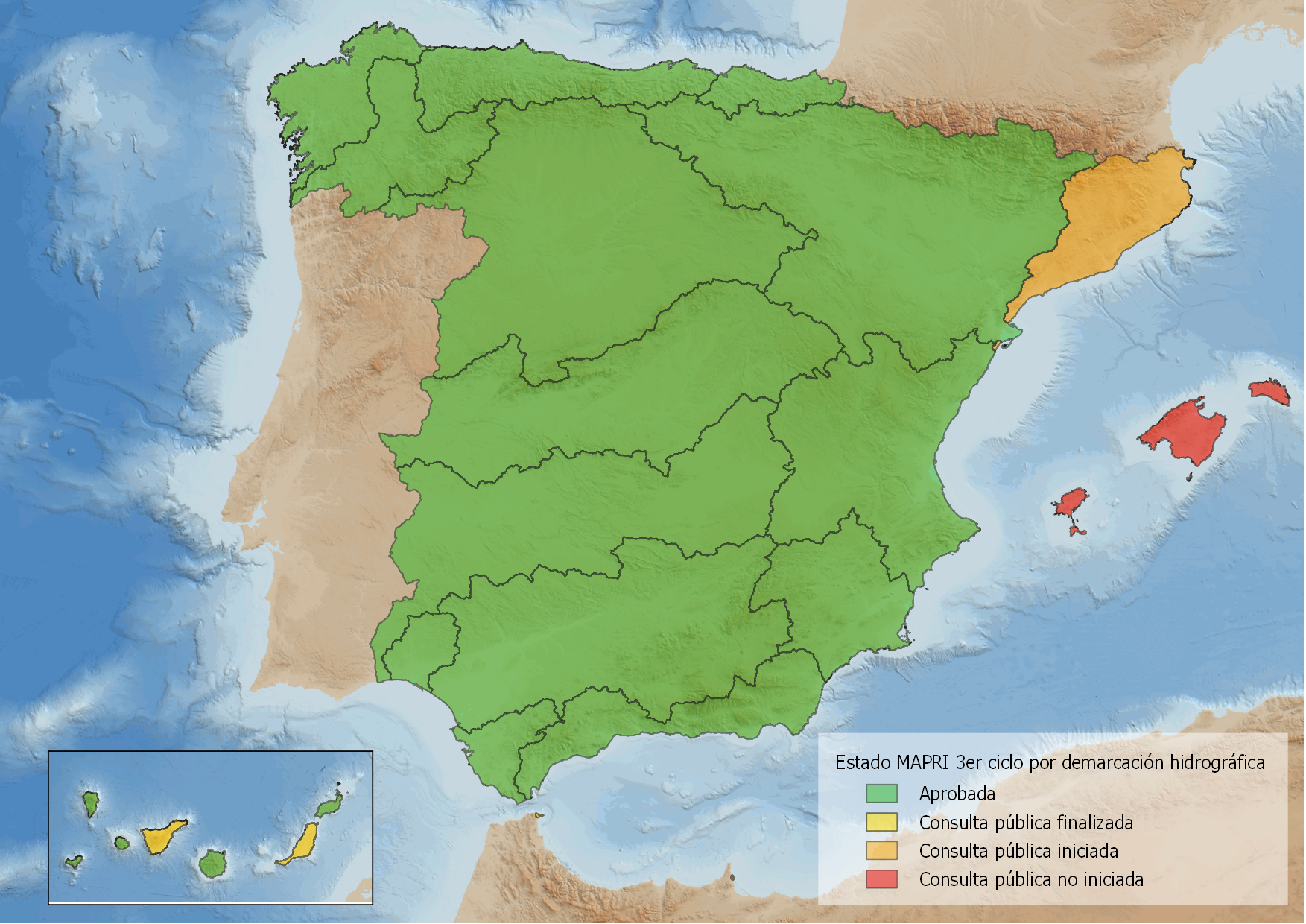 Actualmente se ha aprobado la EPRI del tercer ciclo para las demarcaciones hidrográficas intercomunitarias, así como para algunas intracomunitarias, tal como se muestra en el mapa. Puedes acceder a información detallada sobre las EPRI ya aprobadas y los procesos de consulta pública a través de los siguientes enlaces.