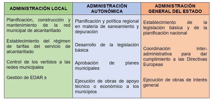 De forma resumida, el marco competencial en materia de saneamiento y depuración de aguas residuales se desglosa como sigue: