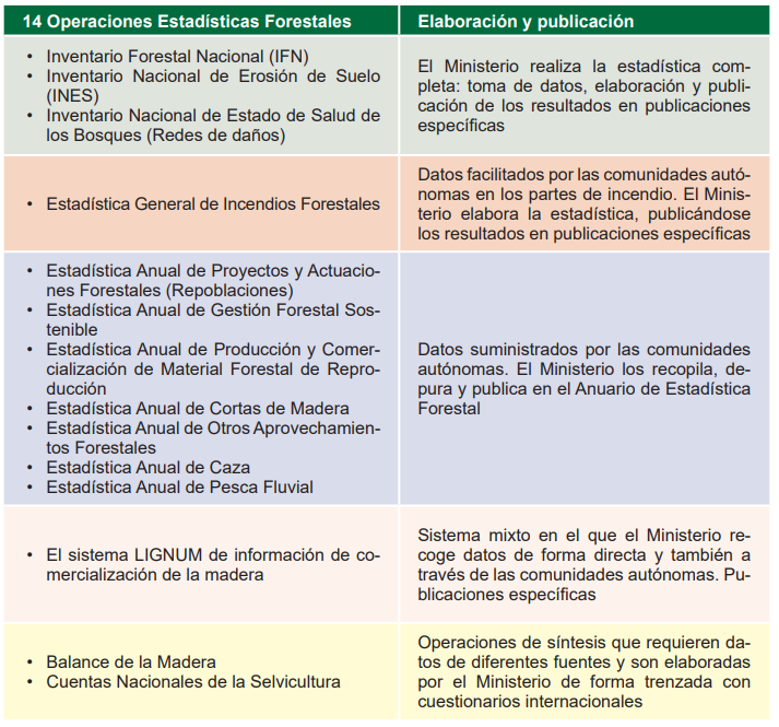Para las operaciones del Inventario Forestal nacional (IFN), el Inventario Nacional de Erosión de suelo (INES) y el Inventario Nacional de Estado de Salud de los Bosques (Redes de daños), el Ministerio realiza la estadística de forma completa, incluyendo la toma de datos en campo y publicación de los resultados de forma independiente para cada uno de los proyectos.