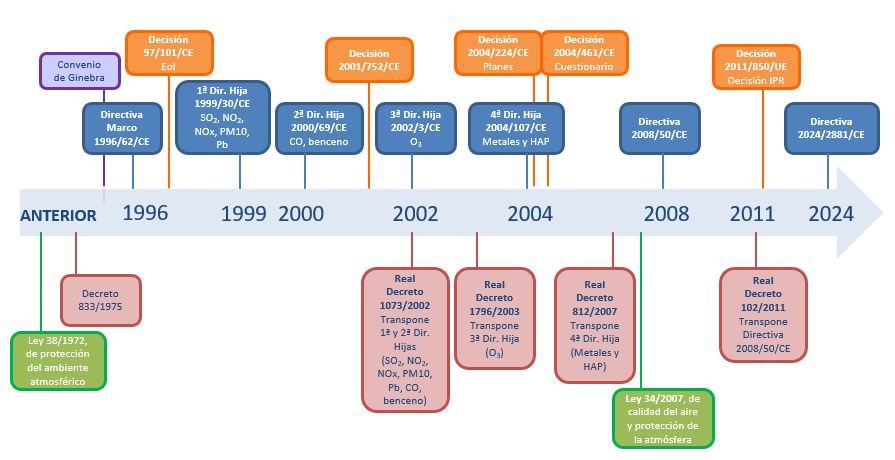 La legislación actual sobre calidad y evaluación del aire tiene su origen en la Ley 38/1972, de 22 de diciembre, de Protección del Ambiente Atmosférico y en la Directiva 96/62/CE (Directiva Marco de Calidad del Aire).